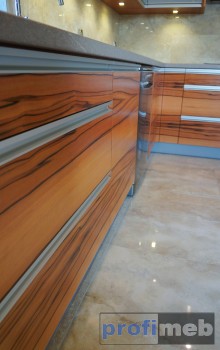 Fronty - płyta MDF oklejana naturalną okleiną egzotyczną (jabłoń Indyjska) z pasowanie słoja, górne fronty lakierowane.